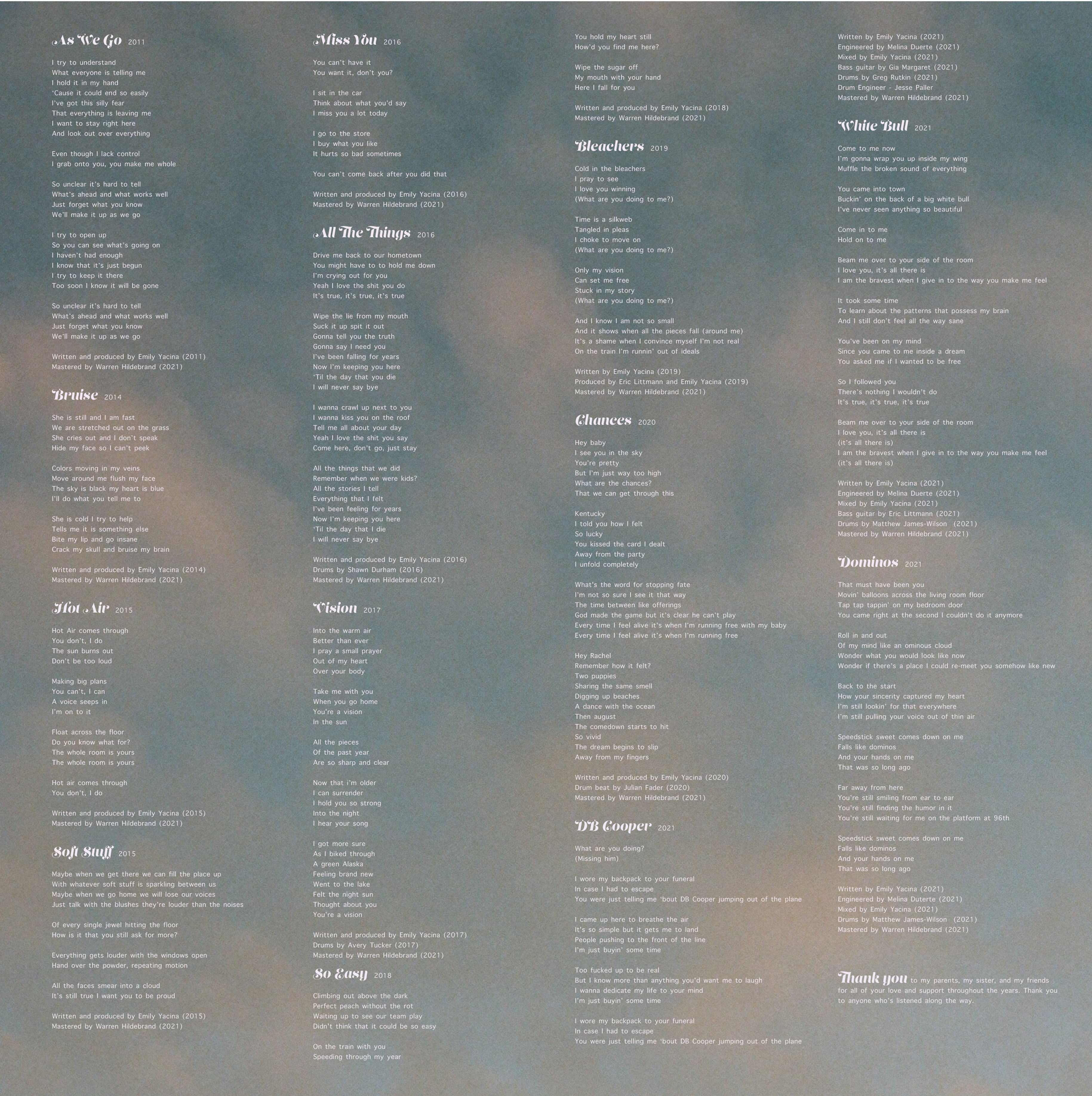 Album artwork and lyrics insert for Emily Yacina’s “All the Things: A Decade of Songs”, released on vinyl in 2021. Listen here